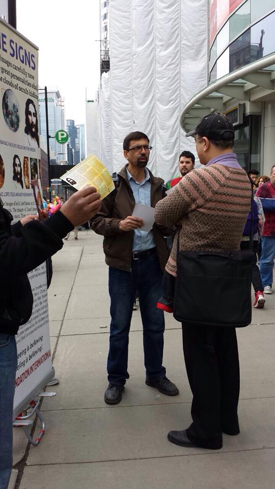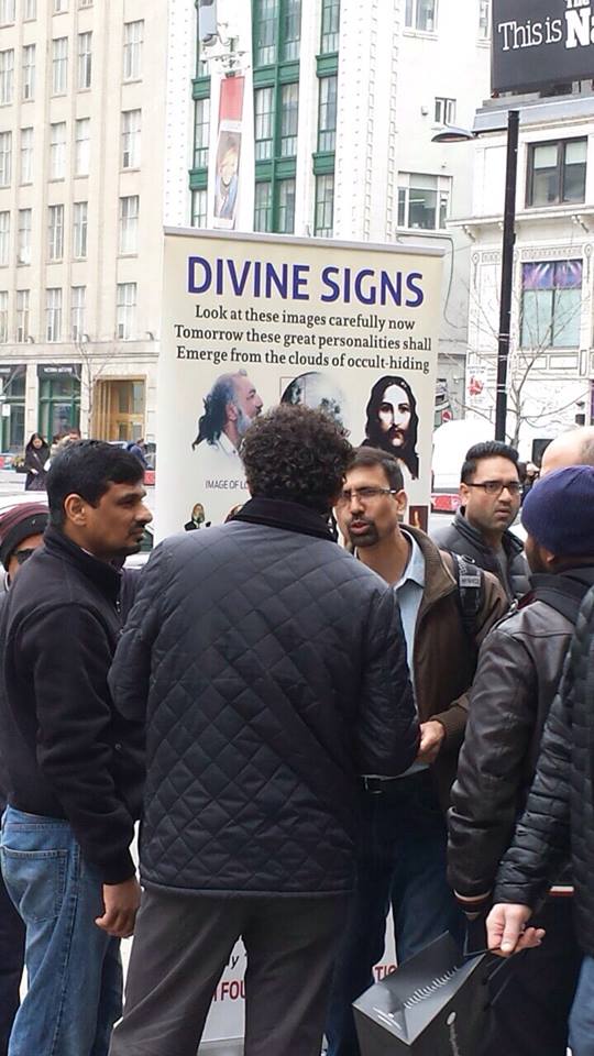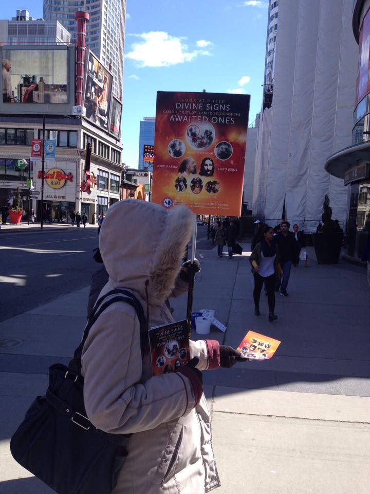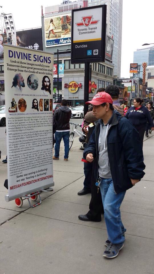 n order to promote the message of divine love and interfaith harmony, Messiah Foundation Canada has been actively leafleting Dundas Square, Toronto. Dundas Square is a busy public square in Downtown Toronto. There, our team also displayed banners depicting the divine signs of Lord Jesus Christ and Lord Ra Riaz. Overall, the response from Torontonians has been wonderful and our team is eager to continue raising awareness of spirituality in Dundas Square!